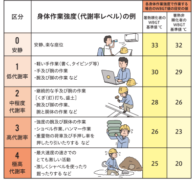 身体作業強度とWBGT値を比べ、基準値を超える場合には、屋内作業では 通風設備やエアコン・除湿機を活用してWBGT値の低減を図る、また屋外作業では 遮光ネット・簡易屋根による日陰確保や休憩所の設置によってWBGT値低減を図るなどの対応が求められます。[3] [4]